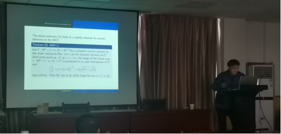 报告首先介绍了平均曲率流(Mean Curvature Flow)的研究背景,包括远古解的定义和性质。远古解是平均曲率流方程的一类特殊解,它们通常与流的奇点研究相关,可以用来刻画奇点处流的渐近行为,报告还提供了远古解的例子,如最小子流形、自收缩子和孤立子等。此外,报告进一步介绍了远古解表现出的刚性现象。报告的核心部分涉及了:在余维数为1时,远古解在最佳增长条件下的刚性结果,即这些解对应着是仿射超平面;在更高余维数下,对于非紧的远古解,存在更好的刚性定理。邱老师详细的讲解了如何利用高斯映射、斜率函数和曲率估计等工具来证明这些刚性结果。通过邱老师的报告,师生们了解了平均曲率流的远古解研究的复杂性,极大丰富了自身的知识。
