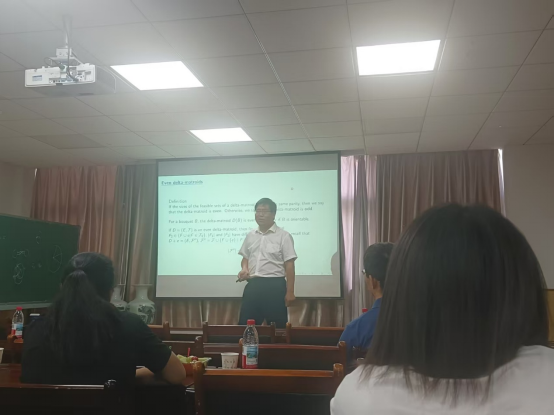 厦门大学金贤安教授的报告题目是《The number of quasi-trees of bouquets with exactly one non-orientable loop》。金贤安教授首先向大家介绍了报告相关的概念以及研究背景,接着向大家报告了他们团队关于quasi-trees的最新研究成果。最后,与本团队教师就支撑树的计数问题进行了探讨,并对接下来本团队可以进一步研究的问题给出了十分有建设性的意见和指导。金贤安教授娓娓道来、细致严谨、条理清晰,极大激发了青年教师和员工们的学术热情,也给大家带来了很多启示。