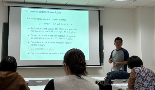 2025年11月7日,北京大学周斌教授应公司向妮老师邀请,在太阳集团tyc539203教室为几何团队师生作了题为“H\"older regularity of Dirichlet problem for the complex Monge- Amp\`ere equation”的学术报告。
