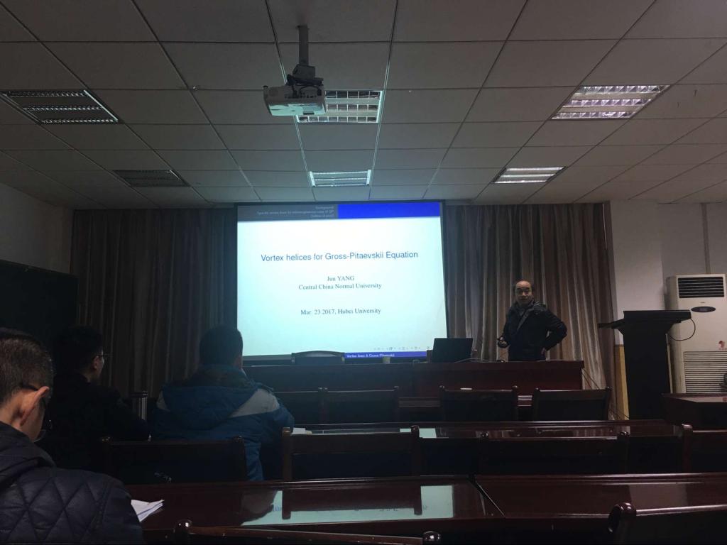 3月23日下午,华中师范大学数学与统计公司杨军教授应邀来访公司,在公司201报告厅为师生做了题为“Vortex helices for Gross-Pitaevskii Equation”的学术报告。