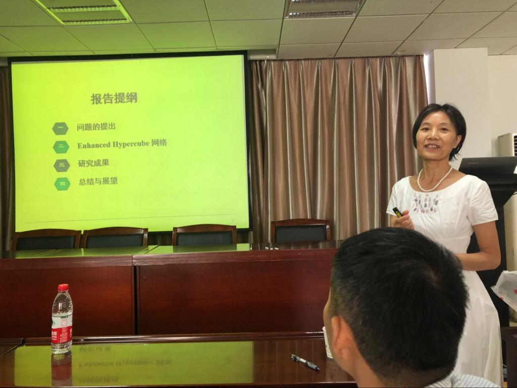 刘红美教授的报告中,首先从超立方体入手,向同学们讲述了相关的基本概念,然后重点地讲解了衡量互连网络容错性的相关问题,并详细地介绍了加强超立方体网络的H-结构连通和H-子结构连通的问题。最后提问环节,同学们与刘教授展开了激烈地讨论。