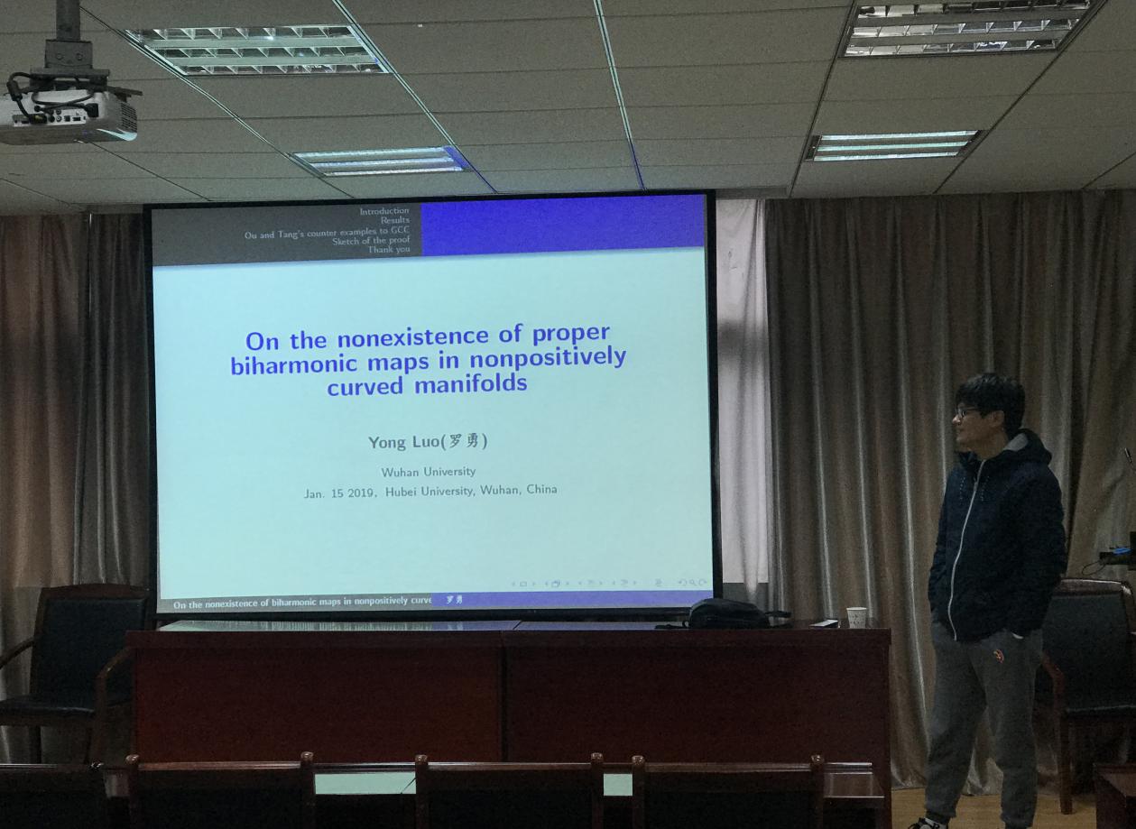 2017年1月15日上午,武汉大学数学与统计公司罗勇教授来公司讲学,在太阳集团tyc539201报告厅作了题为On the nonexistence of proper biharmonic maps in nonpositively curved mannifolds的学术报告。听了罗勇教授的讲座,全体师生获益颇多,受益匪浅。