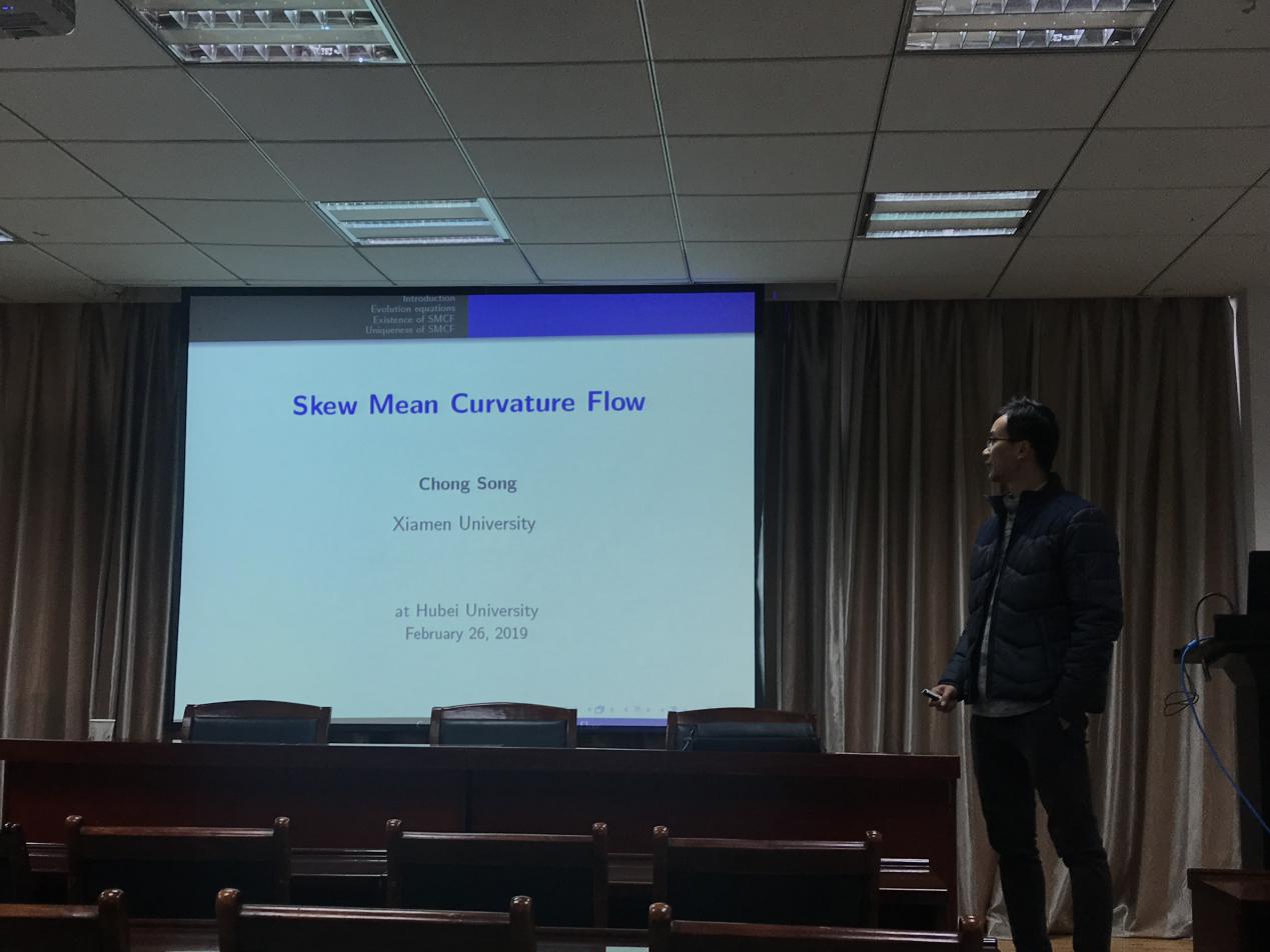 2019年2月27日,厦门大学数学科学公司宋翀教授来公司讲学,在数学与统计公司公司201报告厅为师生作了题为“Skew Mean Curvature Flow”的学术报告。