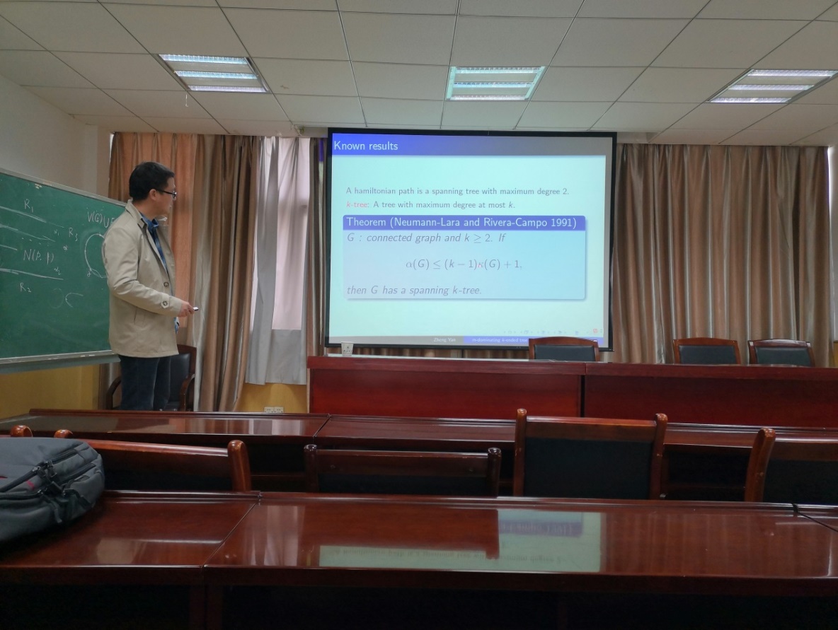 严政副教授主要介绍了n连通图上的m控制的k端点树的相关结论。严政副教授的讲解深入浅出,形象生动,思维严谨,给公司师生很多的启示。