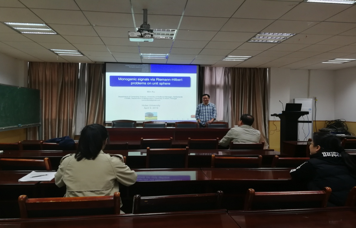 2019年4月9日,葡萄牙阿维罗大数学系库敏研究员应邀来访公司,在院201报告厅为相关师生做了题为《Monogenic signals on unit ball via Riemann-Hilbert problems》和的学术报告。