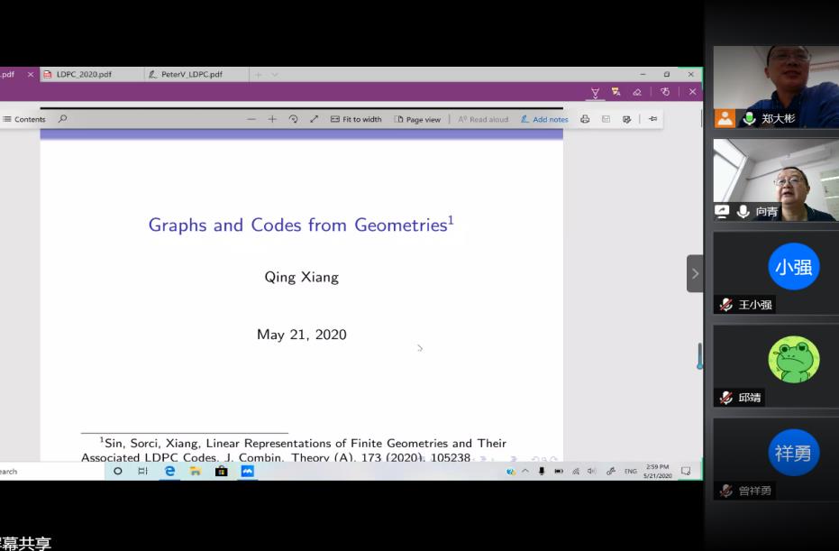 2020年5月21日下午,美国特拉华大学(University of Delaware)向青教授为公司部分老师和研究生带来了一场精彩的线上学术报告,报告通过腾讯会议在线举行,旨在帮助同学们理解几何、编码和图之间的关系。郑大彬教授主持本次会议,太阳集团tyc539经理曾祥勇教授以及数十名研究生参与报告的听取、讨论。