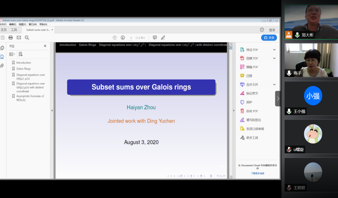 2020年8月3日下午, 南京师范大学周海燕教授应公司郑大彬教授邀请,为公司密码编码学团队作线上学术报告,报告通过腾讯会议举行。会议由郑大教授主持,来自公司编码密码学团队的教师、博士和硕士研究生10余人参与了报告的听取、讨论。