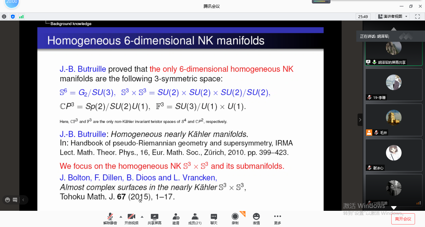 胡泽军教授报告的题目为《The homogeneous nearly Kähler manifold S3×S3and its canonical submanifolds》。报告中,胡老师详细地介绍了其与合作者近些年在齐次nearly Kähler流形S3ⅹS3中关于正则拉格朗日子流形和Hopf超曲面的分类等问题的系列工作。