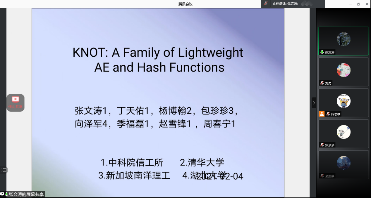 会议伊始,张文涛研究员介绍了KNOT算法的设计背景;随后,报告围绕The KNOT Family,Design Rationale,Security Analysis,Hardware and Software Performance等四部分进行,对KNOT算法的算法细节、设计原理、安全性分析和软硬件实现进行了详细介绍;最后,张文涛研究员分析了KNOT算法的优点并总结了本次汇报的主要内容。