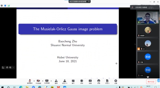 2021年6月18日下午,陕西师范大学朱保成教授应公司向妮教授邀请,为几何团队师生作了题为“The Musielak-Orlicz Gauss image problem”的线上学术报告。