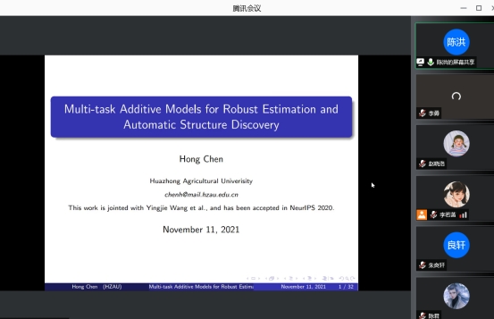 2021年11月11日下午,进行线上学术交流报告,华中农业大学数学与统计学系陈洪教授应公司刘展教授邀请,为公司师生作了一场生动的线上学术报告。本次由刘展教授主持,来自应用统计专业的教师、硕士研究生等共20人参与了报告的听取和讨论。