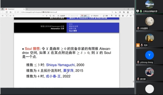 报告中,王雨生教授首先介绍了黎曼几何中的Toponogov定理,然后详细说明了Alexandrov几何的定义、整体化定理和该几何中几个重要的子集,并介绍了Soul猜想的相关背景和部分最新的相关研究进展,最后就这些问题与参会师生进行讨论。参会师生通过此次讲座,对Alexandrov几何、边界猜想等问题有了一定的了解,丰富了自身的知识。