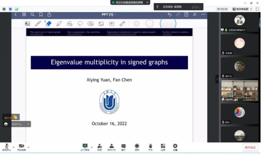 上海大学袁西英老师的报告题目是《Eigenvalue multiplicity of signed graphs》, 袁西英老师首先向大家介绍了报告相关的概念以及研究背景,接着向大家报告了他们团队关于符号图的特征值的重数问题的最新研究成果。袁西英老师的讲解十分细致,生动丰富,深入浅出,使大家获益匪浅。