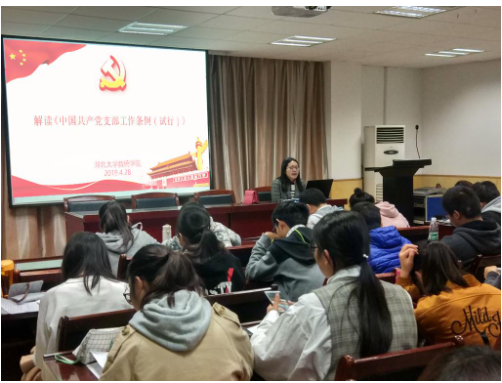 2019年4月28日晚,太阳集团tyc539第七期入党积极分子培训班第六讲在数统201报告厅开讲。此次党课学习邀请了数统院的辅导员马荣老师为学员们作《中国共产党支部工作条例(试行)》辅导报告。