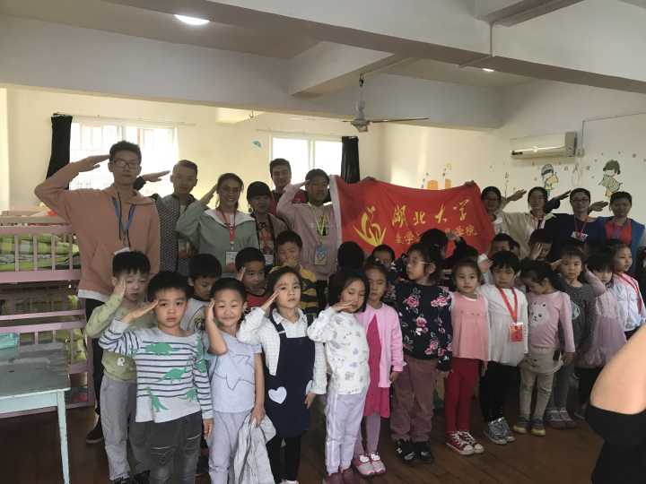 2018年10月31日星期三,暖阳志愿服务队幼儿园&养老院三队进行了本学期第一次志愿活动——为湖大幼儿园大一班的小朋友介绍军运会的相关知识。