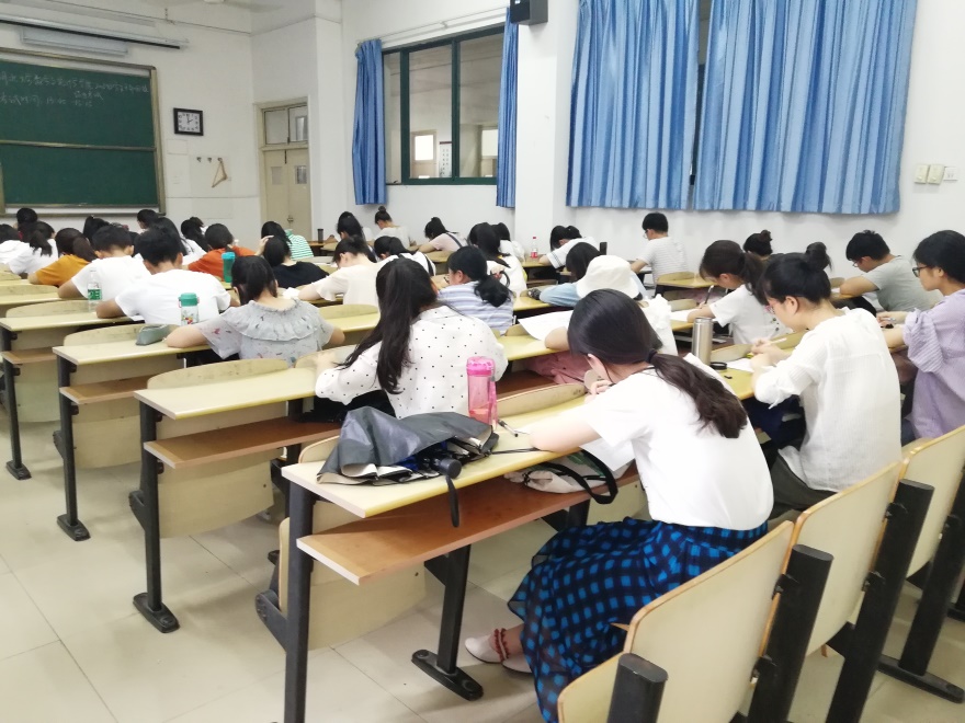 考试期间,有的同学苦思冥想,哀叹连连;也有同学奋笔疾书,落笔成章。同学们秩序井然,纸笔的摩擦声回荡于整间教室,同学们严肃的神情无不彰显着同学们对待这次考试的认真及重视。