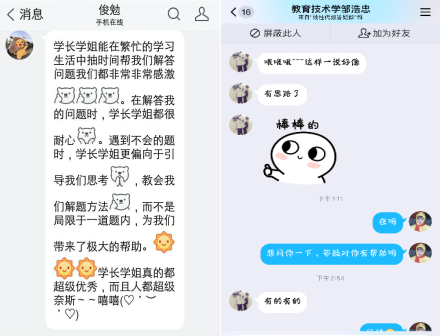 学业朋辈导师们不仅为同学们解答专业课程知识中的疑问,还热心建言献策,分享学习技巧与考研经验,同时鼓励大家认真学习,笃定战‘疫’信心”。不少同学表示,学业朋辈导师们的知识点讲解清晰、耐心细致,同时也积极提出改进建议,与朋辈导师们共同成长。