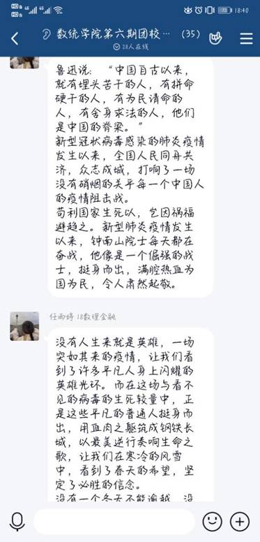 此次团日活动由组织部陈溢纯在线主持。团日活动在分享团歌音频中拉开帷幕,紧接是以团小组为单位进行分享,分享内容为前期小组讨论的学习成果。第一组在小组长的带领下学习了有关武汉金银潭医院经理张定宇的故事,张定宇同志隐瞒了身患渐冻症的病情,顾不上感染新型冠状病毒感染的妻子,依然坚守在抗疫前线,他用渐冻的生命与千千万万白衣天使一起,托起信心与希望,托起无数人的生命与健康;第二组由小组成员分别讲述自己的所见所闻,有的同学提到了为受灾地区慷慨解囊的工人、农民,有的同学提到在基层收集资料的党员,还有同学提到了投身于志愿服务的志愿者以及投身一线的医护人员,正是他们撑起了我们的保护伞才将疫情控制在了一定范围之内;第三组集体观看了视频“三十三”,视频记录了这次战“疫”中的逆行者们。从外卖小哥、高速司机到一线医护人员、人民军队,每个人都逆行在这场战“疫”中;第四组观看了讲述佛山市中医院疫情期间火速集结,驰援湖北,直奔疫情最前线的视频并了解了金银潭医院经理张定宇的故事,小组成员分别讲述了自己身边的逆行者;第五组通过观看视频了解到许许多多的平民英雄,不畏疫情,冲在前线,帮助人们度过艰难的时刻。最后,团日活动在《逆行者,我想对你说》的视频中结束。