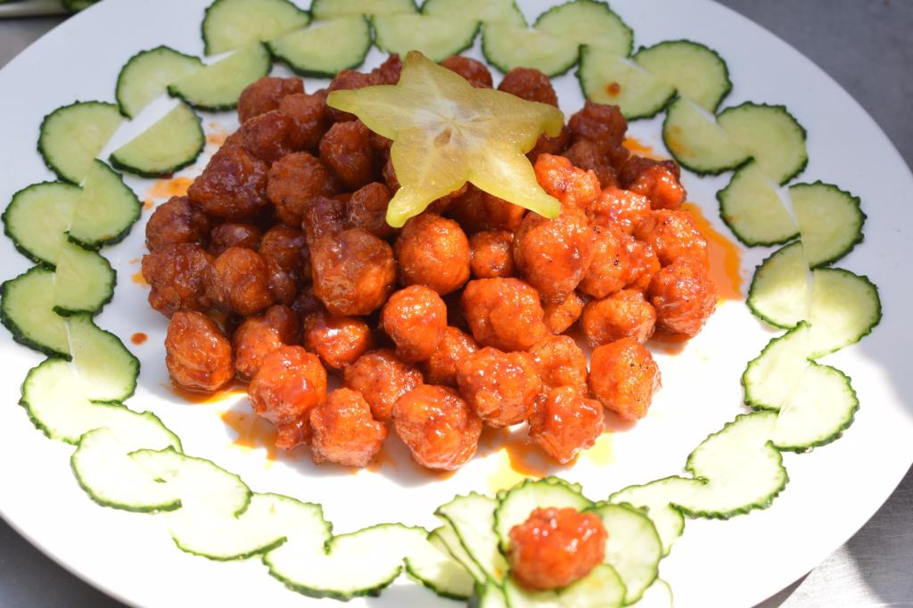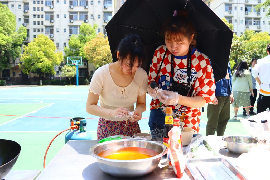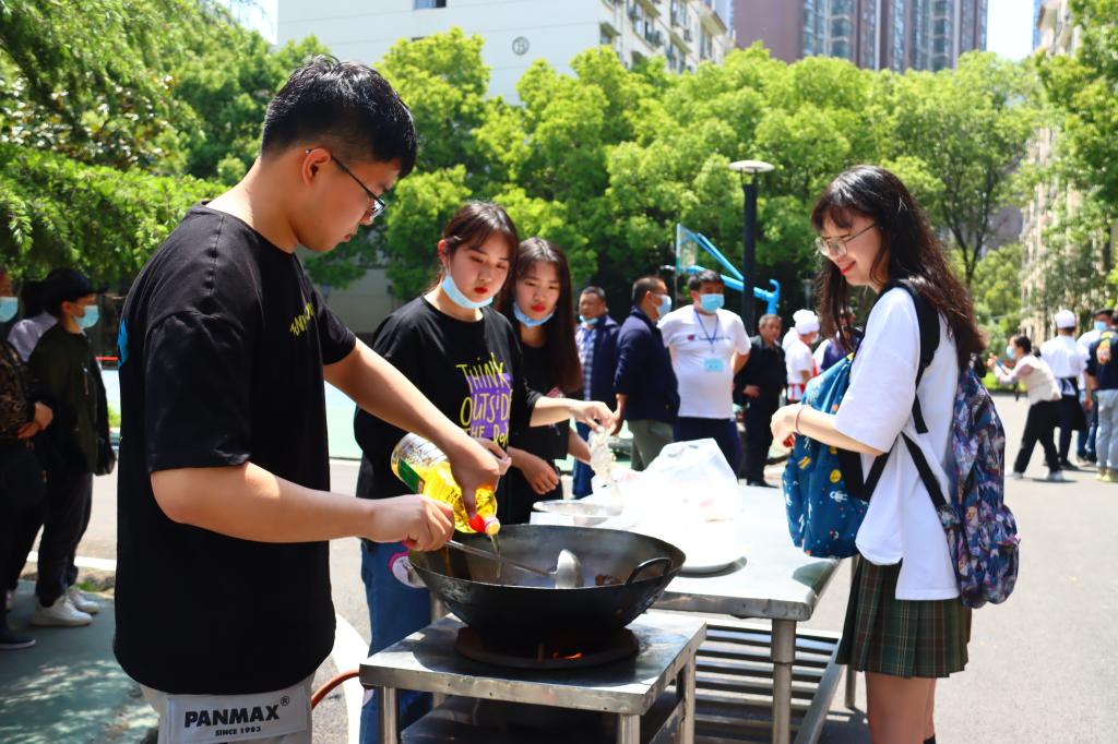 4月末的天气已经有了浓烈的夏天气息,在露天争霸赛场上,各员工团队比赛菜肴的制作更加热火朝天。裹满番茄汁的肉丸,黄色杨桃刻出五角星模样,摆成“100”字样的薯条,2019级美术学专业徐海璐与2019级英语教育专业余思蕾别有心意制作参赛作品“胜利果实”,别出心裁摆盘,象征人民群众团结一致,爱党、拥护党的心,以此献礼中国共产党成立100周年。在众多参赛作品中,还有重述当年长征故事、饱含红色基地风味以及中华民族悠久历史的特色菜肴,满目琳琅。