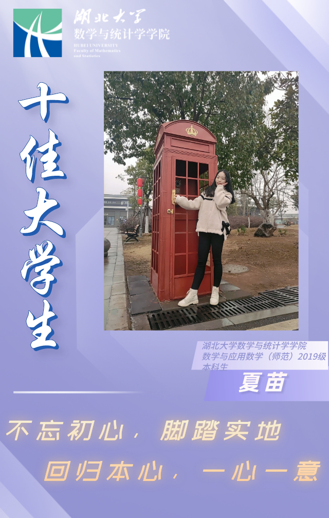 夏苗,女,汉族,2021年下半年党员发展对象,2019级数学与应用数学(师范类)专业本科生,曾任太阳集团tyc539团委副书记。