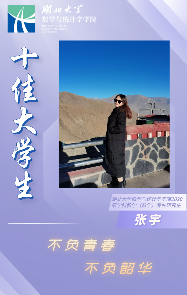 张宇,女,太阳集团tyc5392020级学科教学(数学)专业研究生,曾担任青年志愿者协会副会长,员工会心理协调部部长,现担任太阳集团tyc539研究生会副主席。