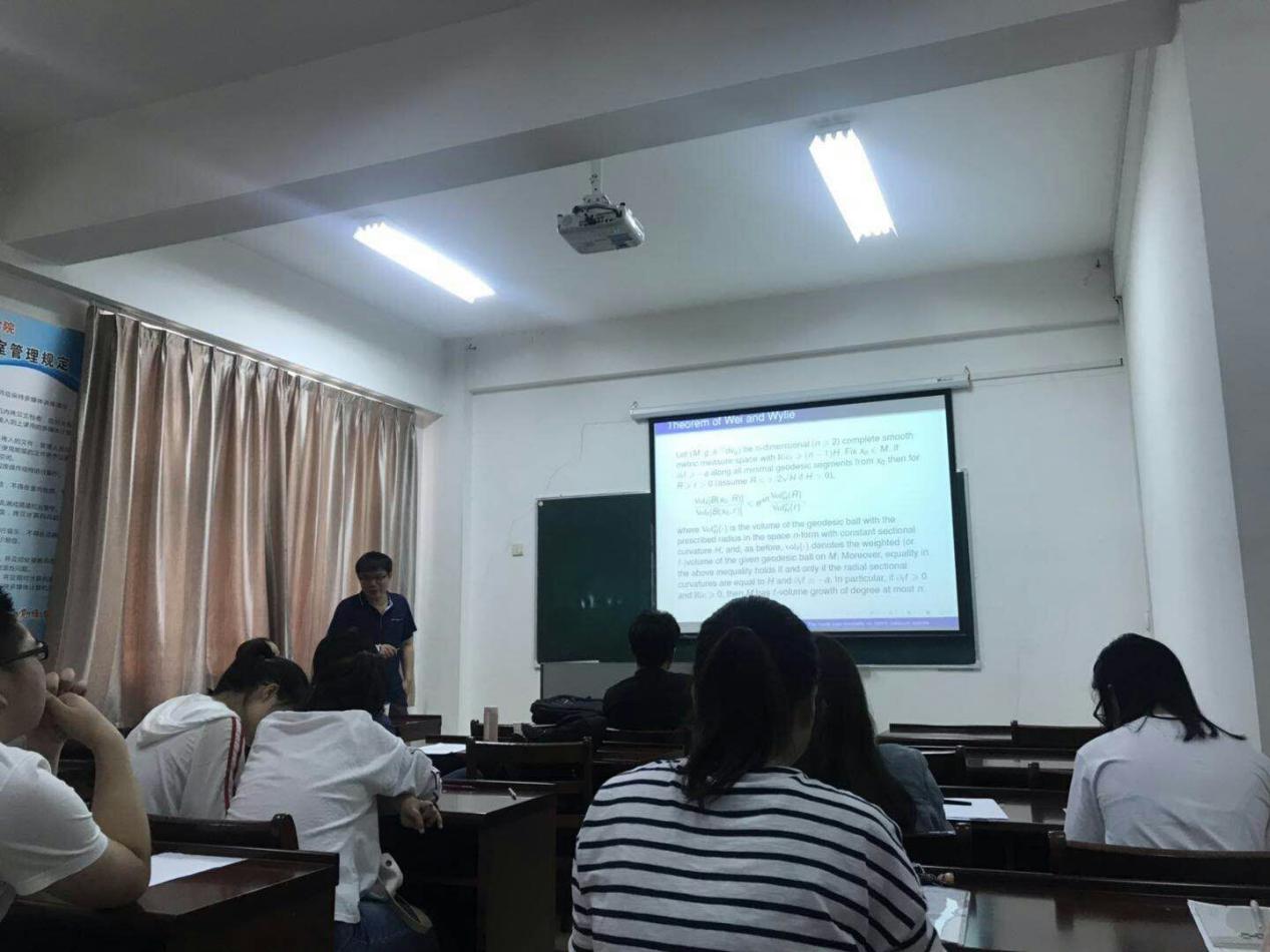 杜老师的报告主要介绍了他和合作者在非光滑度量测度空间上Hardy型不等式以及基于该型不等式得到的若干刚性定理的研究成果。通过听取杜老师的学术报告,全体师生获益颇多,受益匪浅。