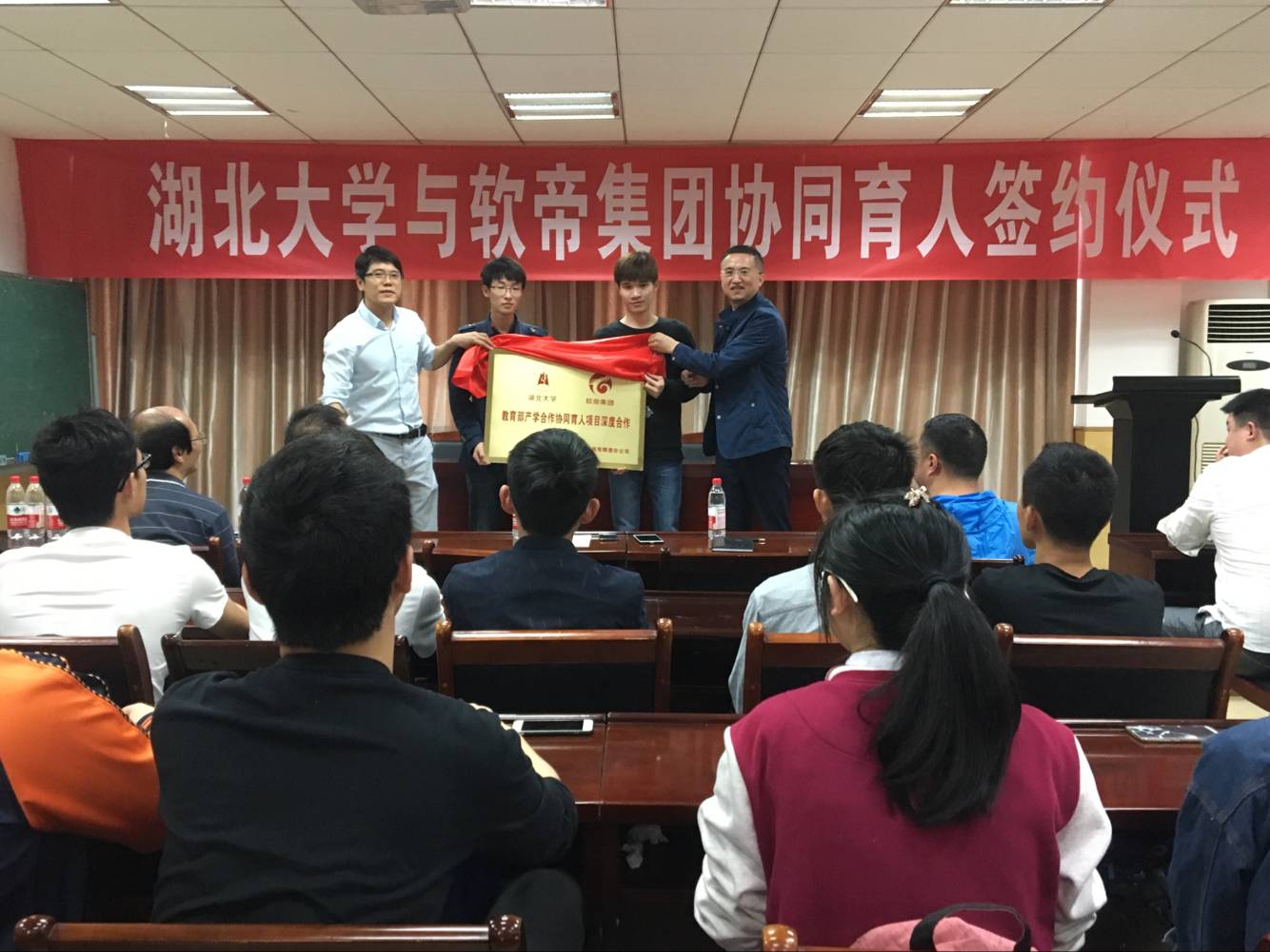 软帝集团董事长李杰和教务处李其锋在热烈的掌声中共同为本次签约仪式揭牌。随后李杰先生同太阳集团tyc539陈媛等八位成功申请项目的教师进行了庄重的现场签约仪式。