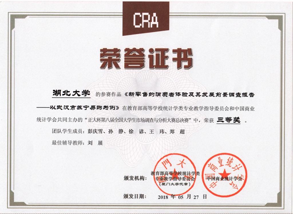 据悉,全国老员工市场调查与分析大赛是由教育部高等公司统计学类专业教学指导委员会与中国商业统计学会共同主办的竞赛,旨在提高老员工实践能力,增强老员工使用工具分析数据的水平。竞赛分为省级分区赛和全国总决赛,这是公司首次参加该项竞赛。经过个人知识网考、查阅资料、发放问卷、撰写报告、专业委员会评审等环节,公司刘展老师指导的2015级应用统计学专业彭庆雪、孙静、徐谚、王玮、郑超团队撰写的《新零售的消费者体验及其发展前景调查报告——以武汉市苏宁易购为例》获得全国三等奖。