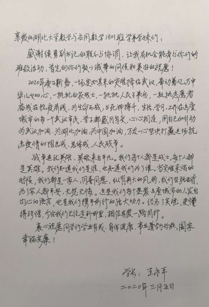 面对此次疫情,侯勇向同学们提出了几点叮嘱:一是要常怀敬畏之心。敬畏自然、敬畏生命是一种态度,是青年学子内心真正的修养。人是天地一份子、享受天地间一切,我们要敬畏生命,才会珍惜生命,活在当下,开心过好每一天,感受生命的高贵与美丽;我们要敬畏自然,热爱自然、保护环境、维护生态,爱护家园,从爱护一颗小树苗开始,相信自然就会回馈于我们;二是要常持学习之心。突如其来的疫情,打乱了我们的学习计划,改变了我们的学习方式,同学们要调整好生活节奏,调整好作息时间,制定好学习计划,利用好学习工具。班级可探索建立在线班级学堂、线上互助学习小组、专题交流园地等方式,把“空中课堂”真正利用好。除专业学习外,我们还要利用好闲暇时间,注重疫情防护知识的学习,以及关于生命、伦理、安全、心理等知识的学习,充实自身的知识和人文素养;三是要常念感恩之心。感恩是一种美德,是我们对生活的态度。我们要常念感恩之心、相助之情、相识之缘,感恩党和国家的温暖、家长的念叨、公司的挂念、师长的叮嘱、同学的问候,我们要把这些恩化为力和行,带着乐观、积极、善良、宽容、孝顺、理解、真诚、奉献去生活。阳光总在风雨后,我们要学做一株向日葵,每天面对阳光,笑出灿烂,带着满满的正能量,以寸草心,报三春晖。