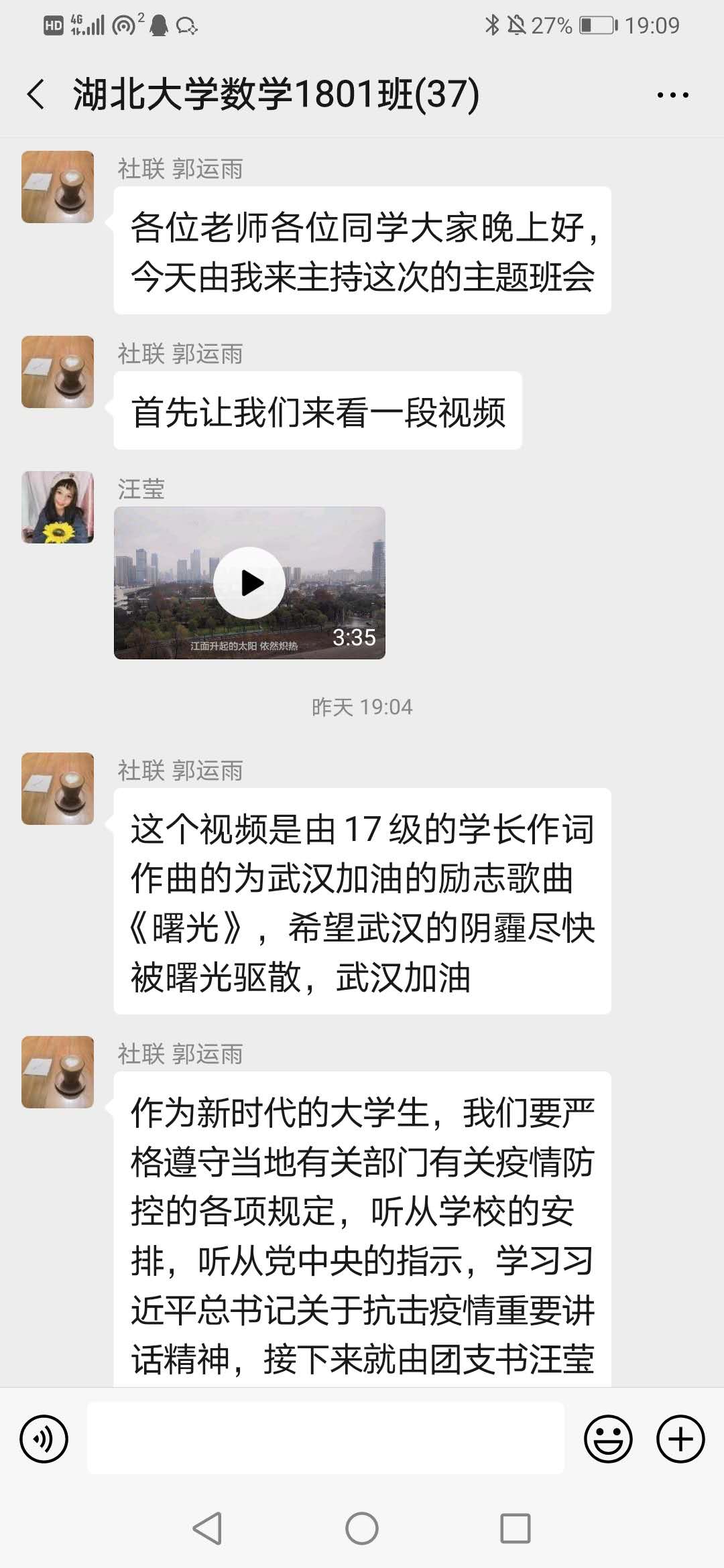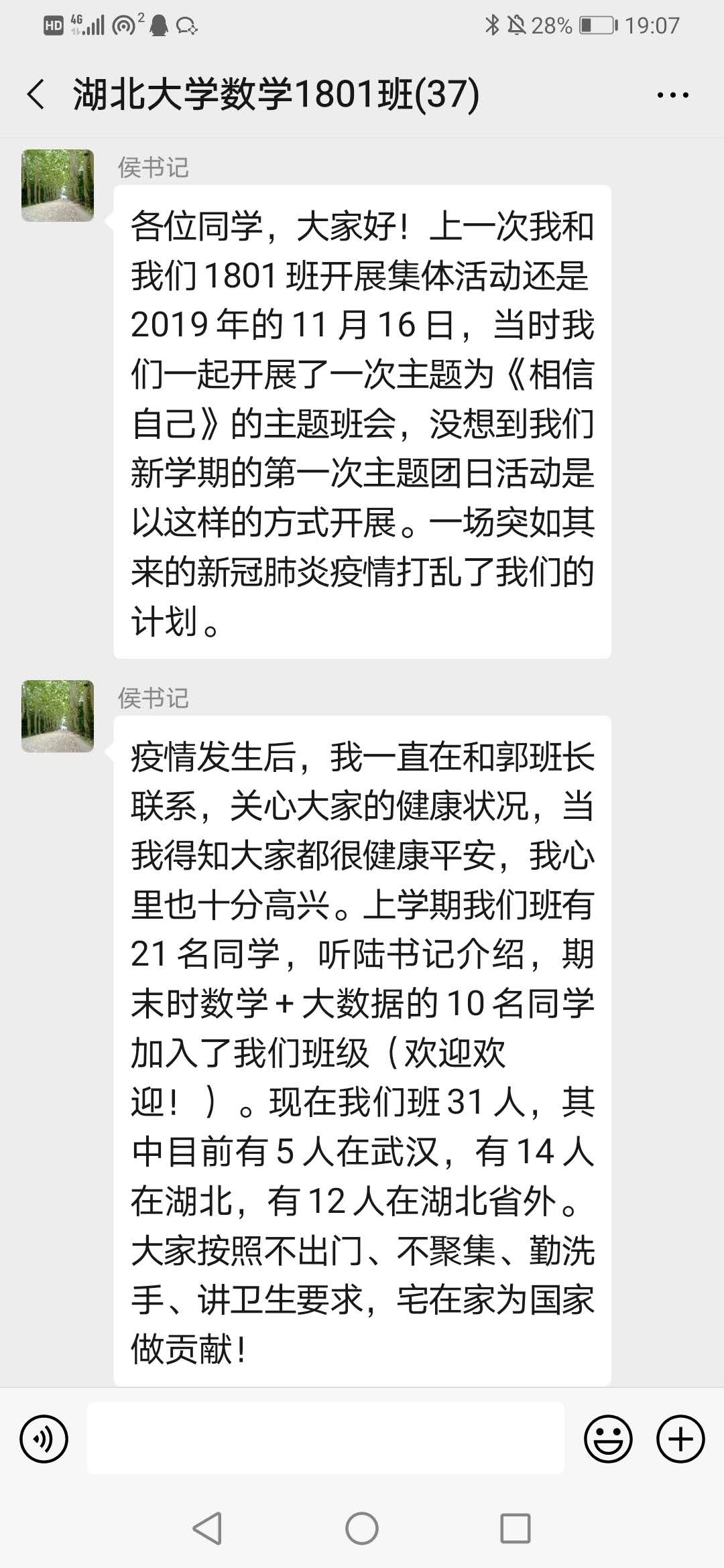 “别问我是谁,别问我为谁,我们都是一家人,同喜同悲。不管有多苦,不说有多累,风雨一定会过去坚强面对。”这是公司党委副书记侯勇将现任湖北省文联副主席的王永平员工作词的全国抗疫优秀公益歌曲《知道我为谁》带入到主题团日活动中,用于激励员工们携手共进,共抗疫情。3月5日晚,侯勇参加了太阳集团tyc539数学与应用数学1801班召开的以“开展云团日,厚植爱国心”为主题的团日活动。数学与统计学公司党委书记万路路、经理曾祥勇出席活动,公司党委副书记、班主任、辅导员也全程参与了活动。