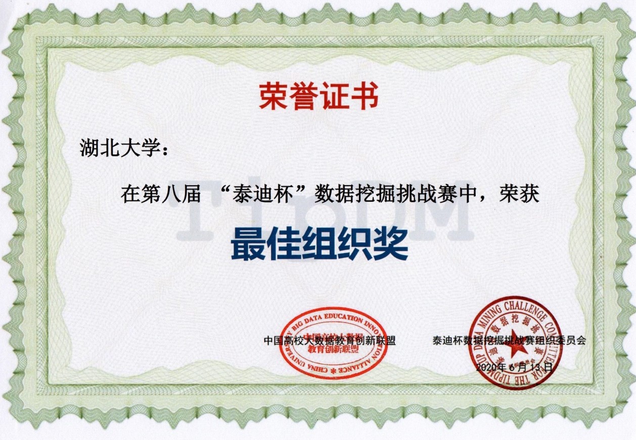 日前,第八届“泰迪杯”数据挖掘挑战赛结果正式公布,公司学子共获得全国三等奖4项,湖北省一等奖1项、二等奖1项,三等奖1项,优胜奖2项,公司也获得最佳组织奖。