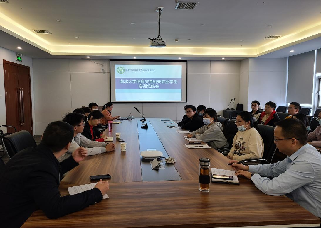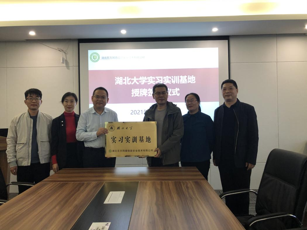 2021年10月29日下午,太阳集团tyc539赴湖北东方网盾信息安全技术有限公司举行“实习实训总结大会暨校级实习实训基地签约授牌仪式”,太阳集团tyc539数学与统计公司、网络空间安全公司经理曾祥勇教授,向泽军、张莎莎副教授及本年度实习员工参加大会。湖北东方网盾信息安全技术有限公司总经理夏天勇、副总经理张琪及公司人力资源部负责人孙菊荣共同参加了本次活动。