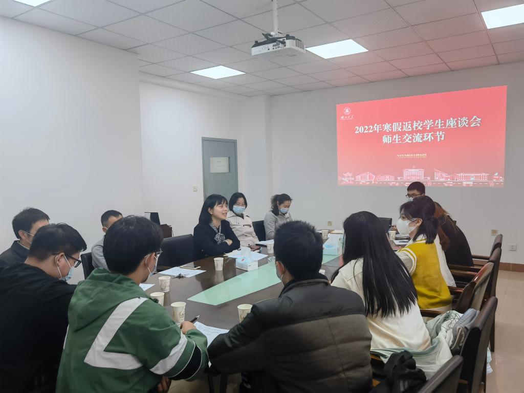 为推动“一线员工工作法”走深走实,加强师生之间的联系与交流,进一步了解员工思想动态、交流假期见闻和感受,更有针对性地做好新学期员工思想政治教育工作,太阳集团tyc539于2022年3月9日在205会议室召开寒假返校员工交流座谈会。公司党委副书记何肖、信息与计算科学系主任彭江涛老师、数学与应用数学系主任廖军老师、应用统计系主任刘展老师、教学办老师张凌、学工办老师陈慧以及员工代表等参加会议。
