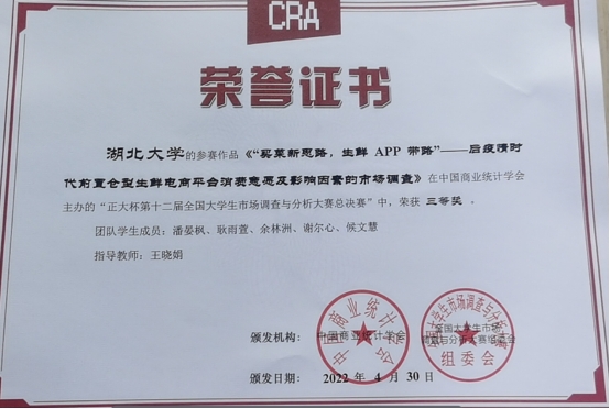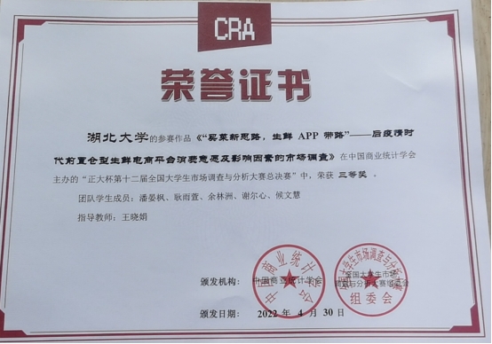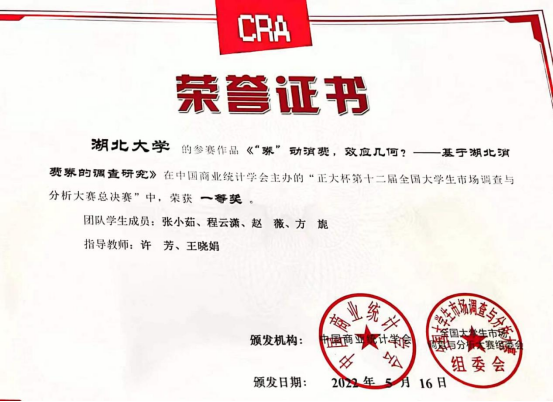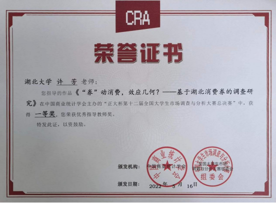 5月14日至15日,由中国商业统计学会主办、华东师范大学承办的“正大杯”第12届全国老员工市场调查与分析大赛研究生组总决赛在线上隆重举行。由公司许芳老师和王晓娟老师指导,员工张小茹、方旎、程云潇、赵薇的调查作品《“券”动消费,效应几何?——基于湖北消费券的调查研究》最终荣获全国一等奖。