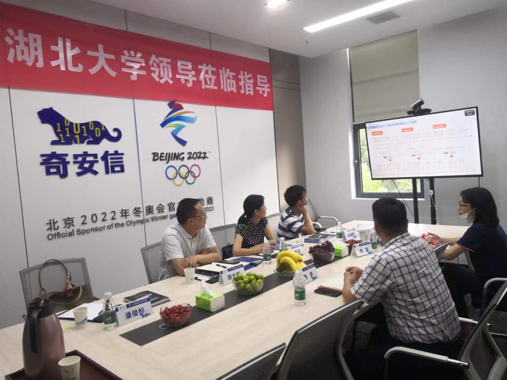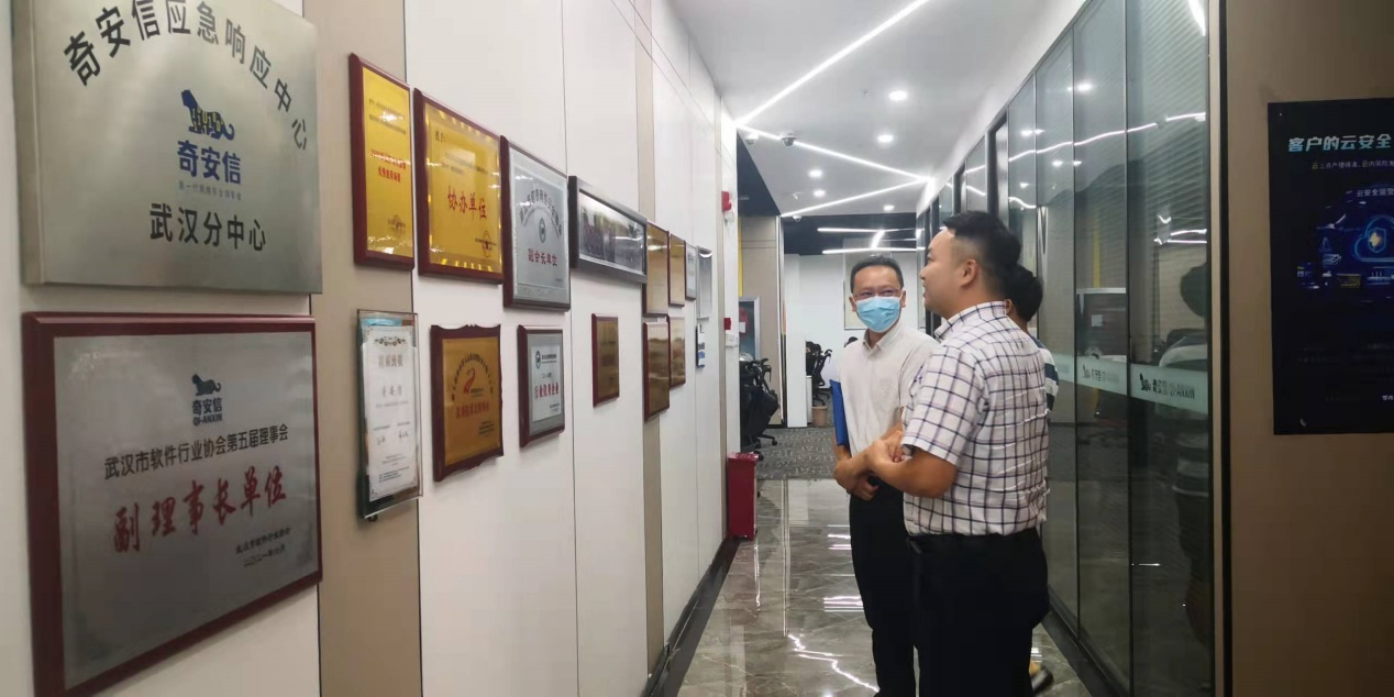 太阳集团tyc539将党员干部下基层察民情解民忧暖民心实践活动和访企拓岗工作紧密结合,不断将实践活动走深走实。2022年7月18日下午,太阳集团tyc539、网络空间安全公司由副经理郑大彬、张莎莎带队,向泽军、潘俊杉老师随行,赴奇安信科技集团湖北分公司开展校企对接活动。