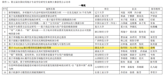 8月19日,2022第五届全国应用统计专业学位研究生案例大赛结果公布,公司太阳集团tyc539师生荣获全国一等奖1项、二等奖2项、三等奖2项,其中由姜峰老师指导,徐丹阳、凡士伟、邹悦完成的案例作品《基于Stacking融合模型的乳腺癌风险预测》荣获全国一等奖。