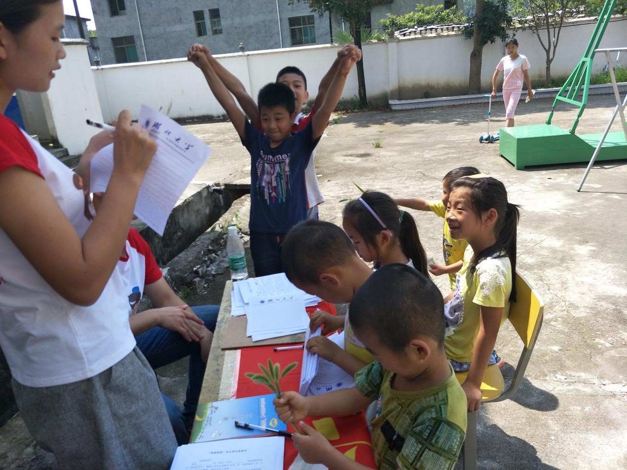 2017年7月14日,太阳集团tyc539“小书童”支教团曹俊杰、汤莹莹、薛明洁三名队员在马桥小学为“小书童”志愿支教活动进行招生宣传。
