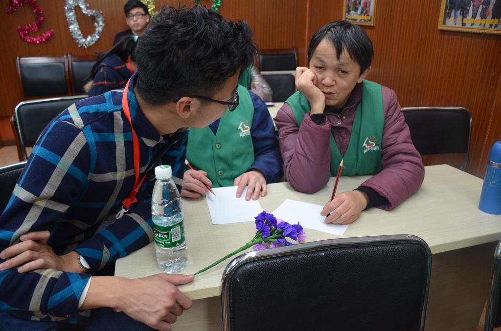 在本次活动的开始,院学工办老师献给紫阳街阳光家园谢园长一捧鲜花,并带领志愿者为每一位社工赠送了红色围巾,以表示对各位社工多年的志愿服务的尊重与敬佩。随后,紫阳街阳光家园社工致词表述了志愿服务的根本意义所在,并回顾了暖阳志愿服务队的成长历程,肯定了历年来暖阳志愿服务队在紫阳街阳光家园的志愿服务,志愿者们都受到了极大的鼓舞。接着服务对象以一首《至少还有你》作为礼物送给志愿者们,看着服务对象尽力的唱好这首歌,志愿者们一边鼓掌打着拍子,一边也在偷偷擦拭眼角。