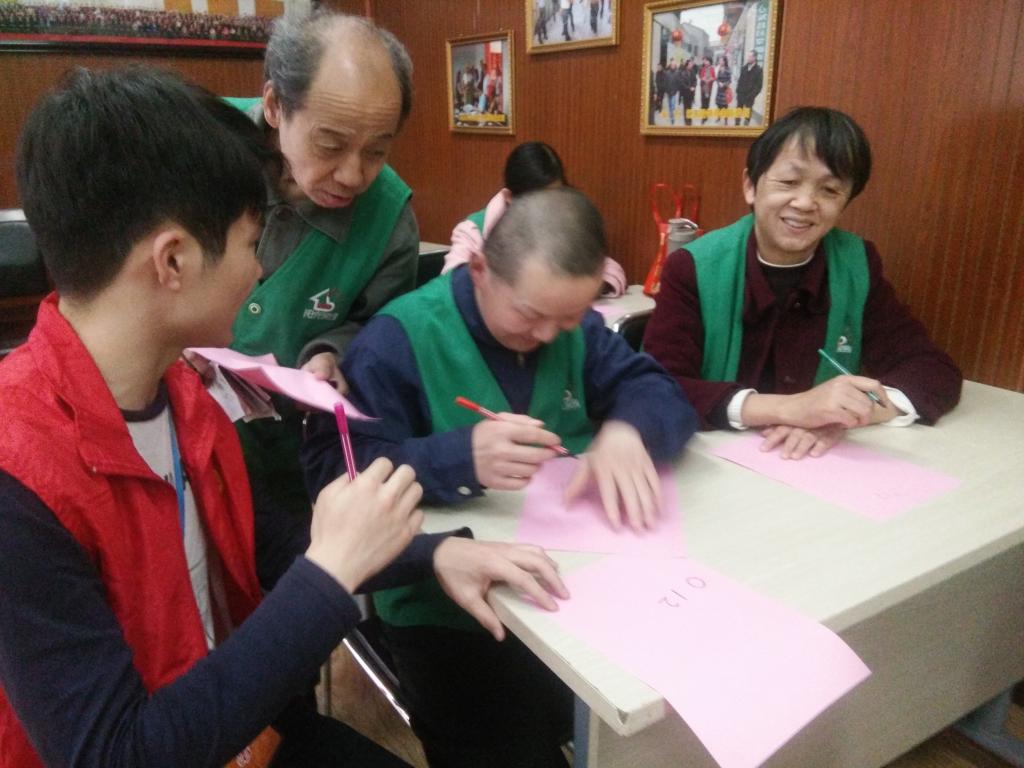 活动开始小老师余子建先做了简单的自我介绍,服务对象拍手欢迎,气氛融洽。随后主持人给每个服务对象都发了一张白纸并让他们在纸上写他们自己的名字以及数字,一听说要写自己的大名服务对象都很兴奋,一笔一画的写出了自己的名字以及小老师的名字。接着就到了做手工的时间,小老师郭镏浠在前面教服务对象折千纸鹤,服务对象一边思考一边动手,不时的服务对象之间还互相问这一步该怎么翻折,大家的热情都很高。在志愿者带领服务对象在折完千纸鹤之后服务对象还要在它们的翅膀上写上喜欢的数字并收集起来,然后由主持人组织让服务对象在其中挑两个,并用纸鹤上的数字让服务对象做一些简单的加减乘法运算以达到回顾知识的目的。为了让服务对象对之前学习的维权意识理解更加透彻,我们设置了买东西被欺骗,拨打12315维权的场景,由志愿者示范然后服务对象学习,大家都很积极主动的参与这个小剧场,达到了的学以致用的效果。本次活动最后在《丢手绢》和《葫芦娃》的音乐声中落下帷幕。