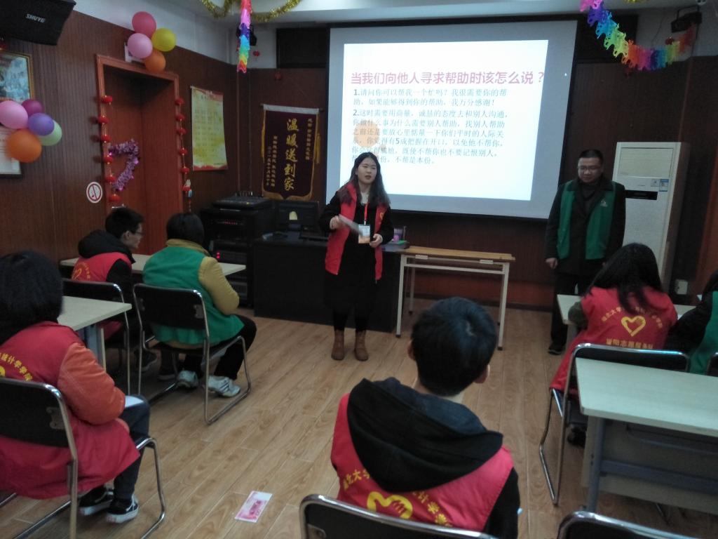 活动开始,志愿者向服务对象们问好并介绍自己。队长朱柄燕向他们分别介绍了周恩来总理和雷锋同志的一生。她向服务对象们讲述雷锋同志热情帮助他人的事迹,使他们认识到当今社会仍需要弘扬雷锋精神。随后进行“助人为乐”情景教学环节,队长朱柄燕邀请了四位服务对象现场演示,使所有人了解“赠人玫瑰,手留余香”的快乐。之后大家一起合唱了歌曲《学习雷锋好榜样》。