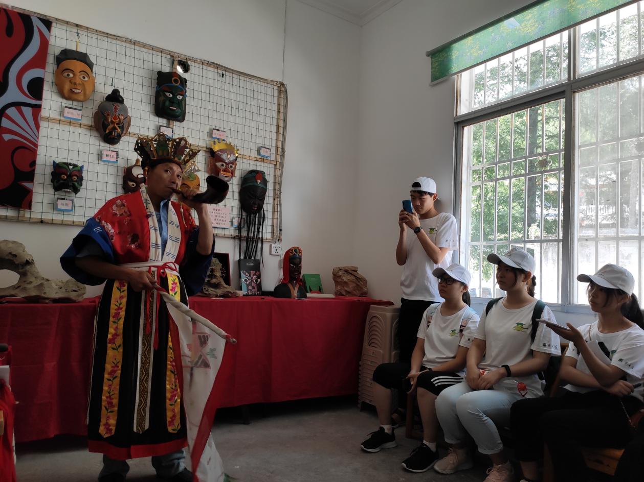 七月十四日下午,在位于燕子坝的恩施市傩文化研究传承基地,团队成员寻访市级傩戏非遗文化传承人--叶世军老师。在燕子坝村支书樊书记的带领下,我们见到了面容清瘦、拄着拐杖的叶老师。叶世军十八岁开始学习傩戏,已经坚持了三十余年,在几年前车祸发生之后,叶世军老师组建了燕子傩戏队。“傩戏起源于二千多年前迎神庙会,由巫戏发展而来,是人们驱除瘟疫,祈求风调雨顺、五谷丰登的一种民俗活动。”叶世军指着墙上挂着的白杨木面具继续说道:“表演者带上面具就被赋予一种神的象征,将人的愿望传递给神。”当谈到傩戏的表现形式时,叶世军介绍到傩公傩婆是土家族人信奉的神,也是傩戏中主要的两个神,在表演前,必须敬奉他们。还有一个唐氏太婆在里面负责管道具,表演前也要先请她,才能开始表演。傩戏里面的人物来自于《封神演义》,每个角色都有一定作用。就傩戏传承与发展的现状,叶世军指出一方面傩戏的传承是一大难题,经济基础决定了传承傩戏的上层建筑。另一方面,他表明发扬傩戏需要依托旅游业,发展傩戏文化可以通过制作生产贴近现代生活的一系列文创产品,如手表,衬衫等。不仅增加了傩戏文化的趣味性,还带了经济收益。叶老师表示这个时代,国家对非遗戏曲的保护,他怀揣着一份感恩。欢迎青年朋友去了解学习傩戏,传承傩戏文化。在交流中,我们认识到,要发展恩施傩戏文化就要在发展中创新,首先将非遗文化数字化保存,建立非遗数字化资源库,使得资源共享,让人们更方便了解,同时利用互联网的力量进行传播。其次,要使傩戏文化深入人心,比如经常开展“戏曲进校园”等活动,将非遗与学习结合,激发员工以及当地人民对家乡文化的热爱之情。最后傩戏非遗文化要与旅游业相结合,形成文化+旅游的创新型模式,文化为旅游带来思想内涵,而旅游带来的收益是文化保护与传承的经济基础与保障。在创新中发展,傩戏文化必将获得更强的生命力。最后,叶世军老师虽然腿脚不便,但还是换上戏服,为大家表演了一段傩戏,队员感受到叶老师对傩戏的那份热爱。