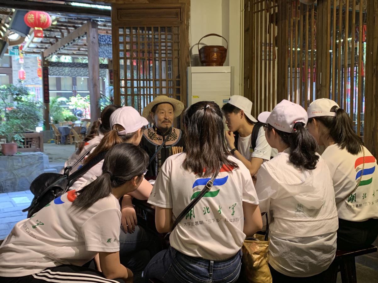 随后,另一组队员赶赴到恩施老城区四维街星光剧社,就戏曲文化传承和发扬问题,采访了75岁高龄的剧社负责人潘先生。潘先生一直从事京剧行业,他告诉调研团队,剧团会经常去周边农村表演,广受村民的喜爱。他强调戏曲应该走进群众,让更多的的老百姓了解戏曲,才能发扬戏曲文化。另外,他谈到剧社资金不足,大家都拿工资来演出,免费表演给村民观看,剧社成员表示只要给村民们带来快乐就心满意足。紧接着,谈及当地戏曲的传承,潘先生忧心忡忡:当地戏曲曾深受土家儿女的喜爱,但随着人们文化生活的需求变化,观众锐减,现在没人愿意学习戏曲,今天的戏曲如南剧、灯戏等已经在逐渐消失了。最后,潘先生为队员演唱了一段灯戏——百年一渡,一段故事,一段情,节奏欢快,气氛热烈。