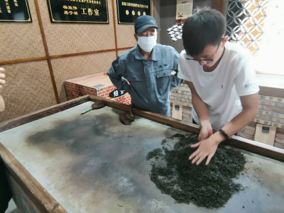 在文化体验馆,团队成员见到了制茶老师傅陈昌文。陈师傅向团队介绍了恩施玉露的生产过程,包括摊青、蒸青、搧干水气、整形上光等10道工序,并向实践团队队员们一一展示流程。为了更加真实地与茶相融,团队队员亲身体验了关键环节“整形上光”的制茶工艺。